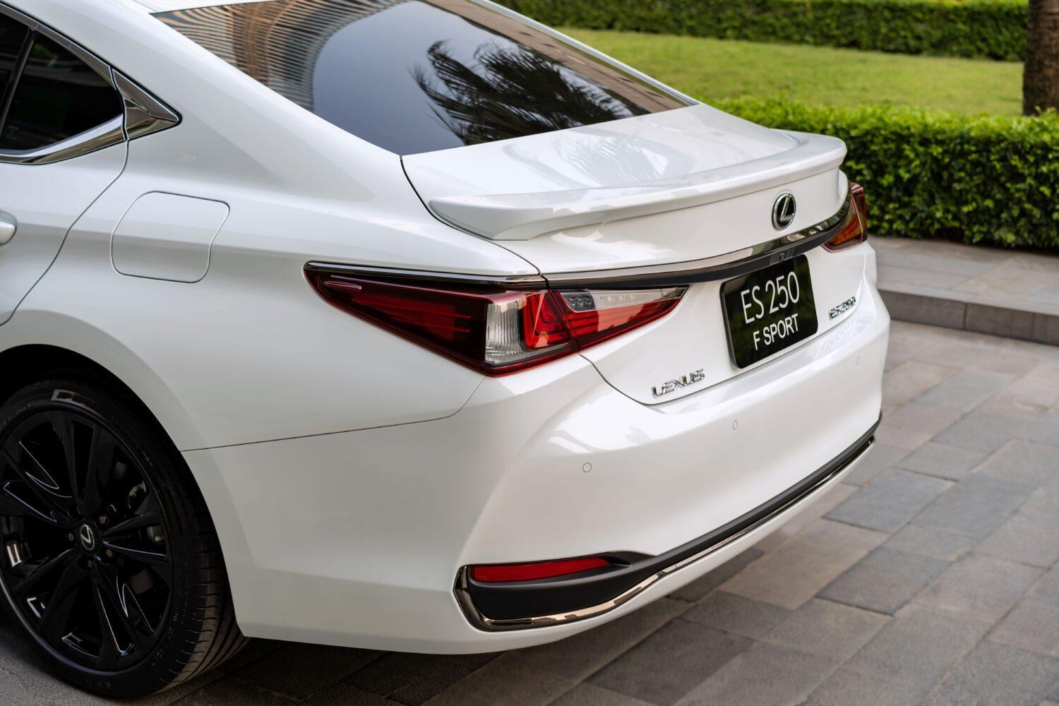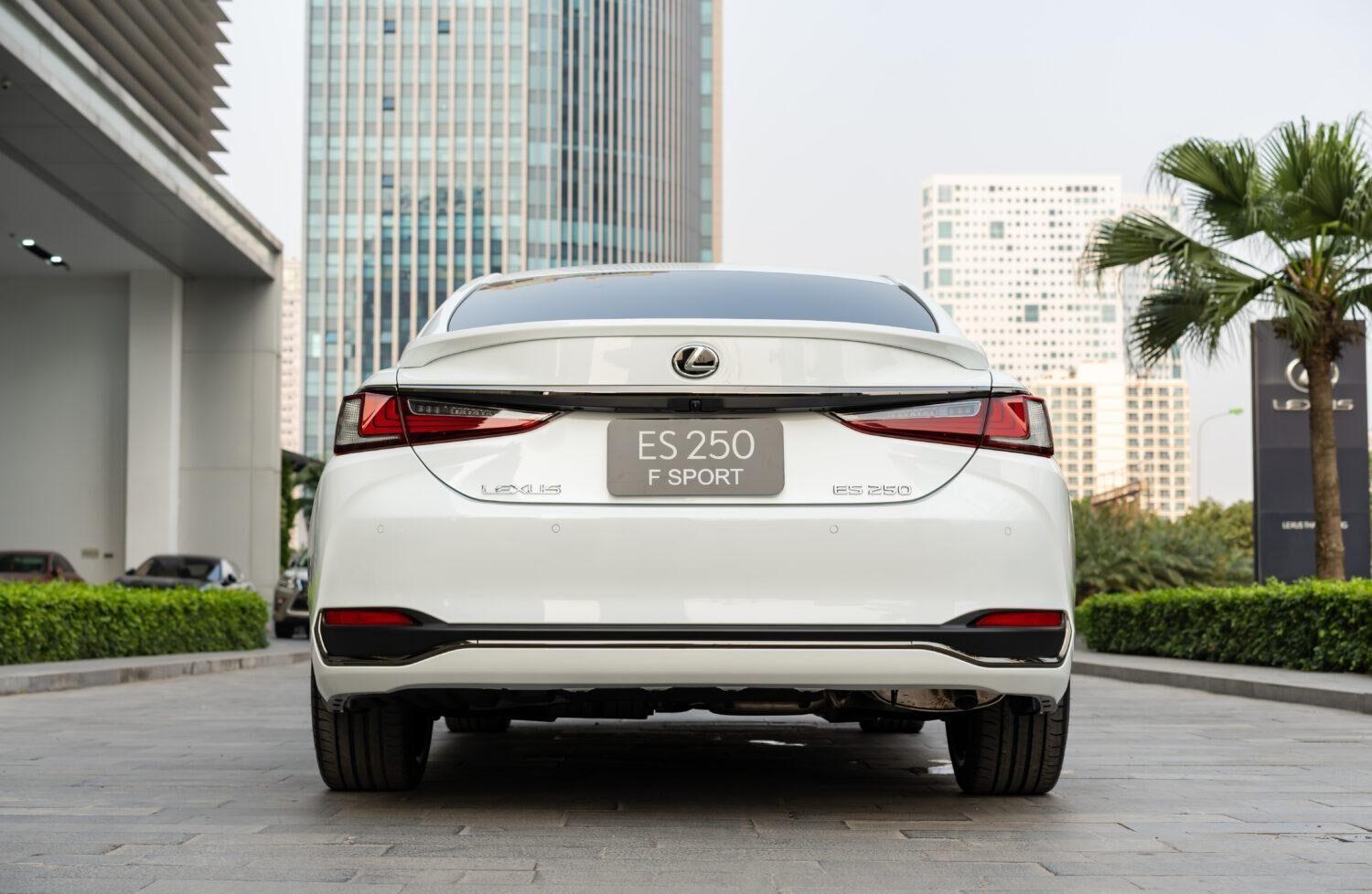 Hệ thống đèn sau của ES250 F Sport có hình chữ L, kết nối với nhau bằng thanh crom to bản vuốt đều hai bên. Phía dưới có tích hợp camera lùi và nút mở cốp.