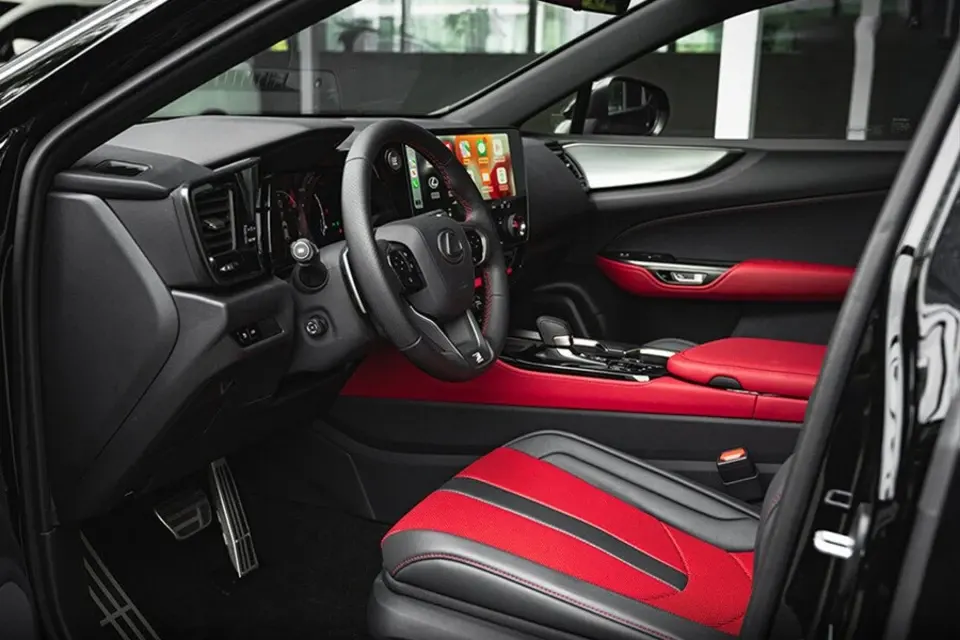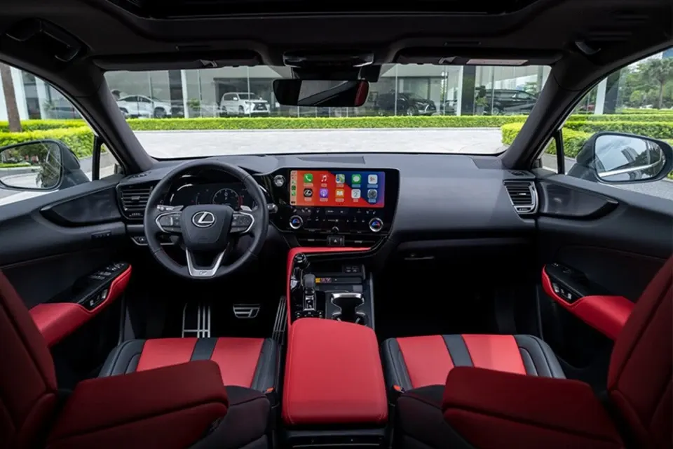 Tổng thể cabin xe Lexus NX 350 F Sport thế hệ mới có sự lột xác đáng kể giúp xe trở nên sang trọng, trẻ trung và thân thiện với người dùng hơn. Điều này thể hiện tại khu vực bảng táp-lô với sự xuất hiện của màn hình trung tâm 14-inch cho phép kết nối Apple CarPlay/Android Auto. Thiết kế bảng điều khiển trung tâm và cần số tái thiết kế theo hướng mềm mại và trẻ trung.